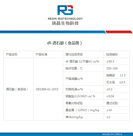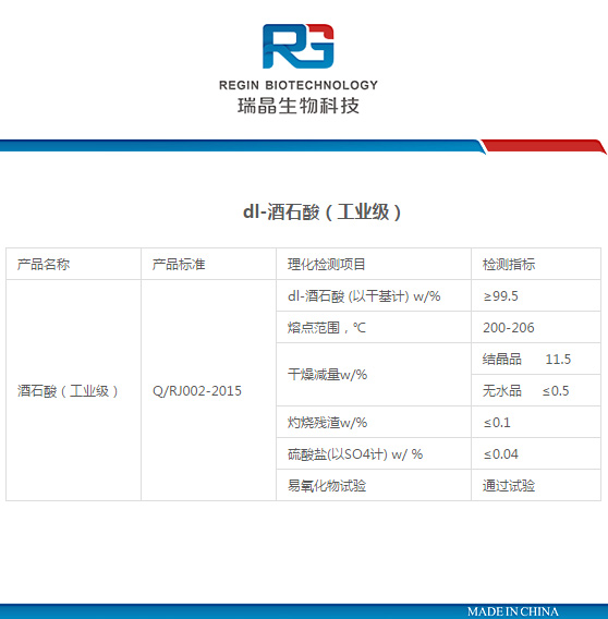 廣泛用于食品、醫(yī)藥、化工、輕工等行業(yè),主要用于制造酒石酸鹽類(lèi),如酒石酸銻鉀、酒石酸鉀鈉等。在食品行業(yè)用作啤酒發(fā)泡劑、食品酸味劑、矯味劑等。其酸味為檸檬酸的1.3倍,特別適用作葡萄汁的酸味劑。本品經(jīng)FAO/WHO專(zhuān)家委員會(huì)鑒定為優(yōu)良之食品添加劑。它在鞣革、照相、玻璃、搪瓷、電訊器材等工業(yè)也有非常重要的作用。